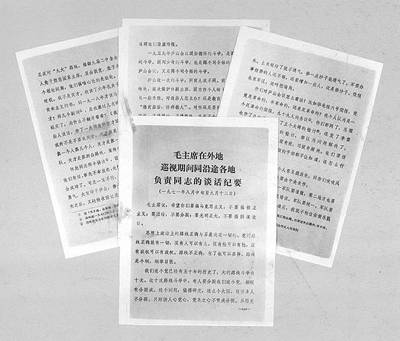 1971年8月中旬至9月12日,毛澤東到南方巡視。沿途與各省和各大軍區(qū)領(lǐng)導(dǎo)談話,指名批評(píng)了林彪集團(tuán)主要成員陳伯達(dá)、黃永勝等人,暗示要解決林彪集團(tuán)的問(wèn)題。圖為毛澤東談話的記錄稿