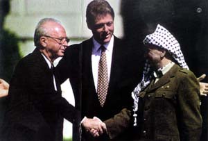 中東和平協(xié)定 | 。保梗梗衬辏乖拢保橙丈衔纾保睍r(shí),巴勒斯坦以色列和平協(xié)議——巴勒斯坦有限自治原則宣言的簽字儀式在白宮南草坪隆重舉行,這是中東和平進(jìn)程中劃時(shí)代的里程碑。 11時(shí)15分,美國(guó)總統(tǒng)克林頓、巴解主席阿拉法特和以色列總理拉賓等走上主席臺(tái),會(huì)場(chǎng)響起了雷鳴般的掌聲。 克林頓總統(tǒng)首先講話說(shuō),巴以簽署和平協(xié)議是歷史性的偉大事件。他表示繼續(xù)支持巴以解決在前進(jìn)道路上的困難和障礙。 。保睍r(shí)40分,以色列外長(zhǎng)佩雷斯和巴解組織執(zhí)委會(huì)成員阿巴斯代表以色列和巴解組織在原則宣言上簽字,中東和談兩主席美國(guó)國(guó)務(wù)卿克里斯托弗和俄羅斯外長(zhǎng)科濟(jì)列夫作為證人也在宣言上簽字。簽字后,克林頓總統(tǒng)分別與拉賓和阿拉法特握手,接著阿拉法特與拉賓握手。這是兩位過(guò)去幾十年相互視為仇敵的領(lǐng)導(dǎo)人首次握手。 出席簽字儀式的還有聯(lián)合國(guó)秘書(shū)長(zhǎng)加利,美國(guó)政要及各界代表等共約3000人。 附:簽字人簡(jiǎn)介 亞西爾·阿拉法特于1929年8月4日生于耶路撒冷。1950年,進(jìn)入開(kāi)羅大學(xué)土木工程系學(xué)習(xí),并當(dāng)選為巴勒斯坦學(xué)生聯(lián)合會(huì)主席。1959年,阿拉法特籌建“巴勒斯坦民族解放運(yùn)動(dòng)”(簡(jiǎn)稱“法塔赫”),并出版《我們的巴勒斯坦》一書(shū)。1964年底他組建了“法塔赫”軍事組織“暴風(fēng)”突擊隊(duì)。1969年,阿拉法特任巴勒斯坦解放組織執(zhí)委會(huì)主席。1973年,他兼任巴勒斯坦革命武裝力量總司令。1989年4月2日,他當(dāng)選為巴勒斯坦國(guó)總統(tǒng),1991年9月蟬聯(lián)總統(tǒng)。1994年7月,他由突尼斯返回巴勒斯坦自治區(qū)主持自治領(lǐng)導(dǎo)機(jī)構(gòu)工作。同年他被授予諾貝爾和平獎(jiǎng)。1996年1月,巴勒斯坦自治區(qū)舉行首次大選,他當(dāng)選為巴民族權(quán)力機(jī)構(gòu)主席。 阿拉法特總統(tǒng)曾10多次訪華。 伊扎克·拉賓1922年3月1日生于耶路撒冷。學(xué)生時(shí)代曾在美國(guó)邁阿密大學(xué)學(xué)習(xí)。18歲開(kāi)始進(jìn)入軍界。1948年阿以戰(zhàn)爭(zhēng)期間任“哈雷爾”旅旅長(zhǎng)。1949年作為以色列國(guó)防軍代表團(tuán)成員參加了阿以停火談判。1950年任以色列國(guó)防軍總參謀部作戰(zhàn)部長(zhǎng)。1952年在英國(guó)坎伯利參謀學(xué)院進(jìn)修。1954年至1956年任以色列總參謀部軍訓(xùn)部長(zhǎng),并晉升為少將。1956年至1959年任北部軍區(qū)司令。1960年至1964年任國(guó)防軍副總參謀長(zhǎng)。1964年至1968年任國(guó)防軍總參謀長(zhǎng)。1968年出任駐美國(guó)大使。1973年春回國(guó)投身于以色列工黨活動(dòng)。1974年1月當(dāng)選為議員,同年6月當(dāng)選為工黨領(lǐng)袖,并出任總理。1984年至1990年任國(guó)防部長(zhǎng)。1992年2月,拉賓再次當(dāng)選為工黨領(lǐng)袖,同年6月,工黨在大選中獲勝,拉賓再度出任政府總理。后遇刺身亡。 |  | | 阿拉法特在會(huì)上發(fā)表講話 |