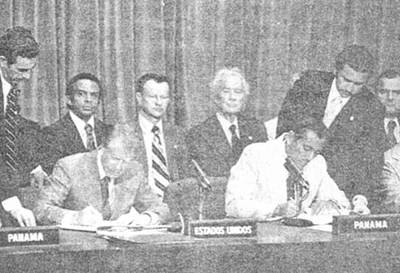 巴拿馬政府首腦托里霍斯和美國建立外交關(guān)系" target="_blank">美國總統(tǒng)卡特在美國第一屆總統(tǒng)華盛頓誕辰" target="_blank">華盛頓簽署新的《巴拿馬運河條約》。