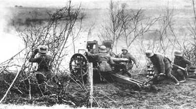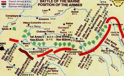 德軍在香檳地區(qū)的野戰(zhàn)炮 馬恩河會戰(zhàn)是第一次世界大戰(zhàn)初期發(fā)生在法國境內(nèi)馬恩河地區(qū)的一次重要戰(zhàn)役。1914年8月,德軍同法、英軍隊 在法國邊境展開激戰(zhàn),雙方共投入350萬大軍。法軍和英軍被迫南撤。9月3日,德軍越過馬恩河。5日,法軍主力經(jīng)過重新部署,在馬恩河一帶200公里戰(zhàn)線上開始反擊德軍,至9日迫使貿(mào)然南進(jìn)的德第一、二集團(tuán)軍撤退到馬恩河以北至凡爾登一線。馬恩河戰(zhàn)役使德軍包抄法軍的計劃失敗,德國在西線速決戰(zhàn)略破產(chǎn),總參謀長毛奇被德皇威廉二世撤職,改由法金漢擔(dān)任。