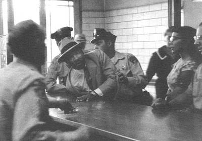 金被帶到了警察局,當著他妻子的面被按倒在桌子上,然后關進了牢房 馬丁-路德-金打算擠入一個擁擠的審判廳,以聽清關于他被逮捕的朋友和同事拉爾夫-阿伯爾南希的事情。金被要求走開,但他沒有動,于是被兩名警察抓了起來(他們不認識金)。當他的妻子科勒娜-斯科特試圖叫喊時,他們威脅她:“低下你的頭,否則你也會被送上法庭”。他們把金拖到警察局并按在了桌前。中士用鑰匙打開一間小囚房把他關了進去。 金被判犯了流浪罪后,開始服刑。他在法庭上演講的副本戲劇性被登在了一份報紙上。在演講中,金強調了有意識抵抗的必要性。警務委員克萊德-塞勒爾斯為金支付了保釋金讓他出了獄。克萊德對記者說,他只想節(jié)約納稅人的錢而已。此時金開始準備出一本新書--《走向自由的步伐:蒙哥馬利的報道》。查爾斯-穆爾,在意想不到的逮捕發(fā)生時正好在聽阿伯爾南希的審判。他所拍攝的照片通過美聯(lián)社傳遍了世界,使輿論震驚,馬丁-路德-金由此獲得了財政上的支持并從此開始大規(guī)模的民權活動。 .jpg\")