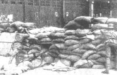 守軍在馬路上布設沙包工事,與敵巷戰(zhàn)