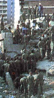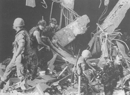 一輛裝著5000磅炸藥的卡車撞破環(huán)形圍欄闖入了營部,260名士兵被炸死 1983年10月25日,美國海軍總司令保羅-凱利到達(dá)貝魯特調(diào)查襲擊海軍司令部事。救援者已從綜合機(jī)場燒黑了的金屬和水泥里拖出216具死尸。大概還有30多具尸體仍在碎石里。人們提出了有關(guān)司令部的安全及里根政府卷入虛弱而不穩(wěn)定的黎巴嫩政治等新問題。 這次行動是一個死心塌地的恐怖主義者干的。他駕駛一輛裝有至少2500磅炸藥的梅賽德斯牌卡車,通過崗哨和設(shè)在司令部的路障之后,向大樓撞去。在一團(tuán)大火中大樓被炸毀。這一4層建筑立刻變成了一堆燃燒著的碎石。一個海軍發(fā)言人說:“除了在越南以外,我從沒見過如此大規(guī)模的屠殺。”貝魯特所有高大的建筑物在爆炸期間都在震顫。 襲擊過后兩分鐘,另一輛裝滿炸藥的卡車沖進(jìn)法國維持和平部隊駐地,58人死亡。 法國新聞社一個話務(wù)員說:這次爆炸是一個號稱自由伊斯蘭革命運(yùn)動組織干的。白宮官員說受譴責(zé)的應(yīng)是與伊朗有聯(lián)系的恐怖主義者。這兩項帶自殺性質(zhì)的任務(wù),與4月份襲擊美國大使館造成63人死亡的事件很相似。 一個海軍發(fā)言人說,美國大使館遭襲擊后對司令部仍未采取特殊的防衛(wèi)措施。里根的國會批評家們說:沒有明確規(guī)定在貝魯特的海軍陸戰(zhàn)隊的作用。少數(shù)派領(lǐng)袖、參議員羅伯特-伯德責(zé)備里根在外交政策上作了根本錯誤的估計。總統(tǒng)向貝魯特派遣300人來接替死傷的維持和平人員的工作。里根說:“堅持在貝魯特留駐陸戰(zhàn)隊對維護(hù)我們在全世界的聲譽(yù)來說是至關(guān)重要的。