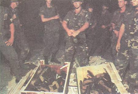 美國海軍陸戰(zhàn)隊員展示出在格林納達小島發(fā)現(xiàn)的一個武器儲藏窖