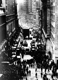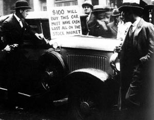 圖中的牌子上寫(xiě)道:“100美元可買(mǎi)下這輛轎車(chē),在股市上喪失了一切,急需現(xiàn)鈔。” 1929年10月19日,美國(guó)紐約市場(chǎng)上出現(xiàn)拋售股票浪潮,股票價(jià)格大幅度下跌。到10月24日(星期四),由舉國(guó)上下謠言四起造成了金融不穩(wěn),人們驚恐萬(wàn)狀,被嚇壞了的投資者們命令他們的經(jīng)紀(jì)人拋售股票,導(dǎo)致美國(guó)股市崩潰。這一天被稱(chēng)為“黑色星期四”。人們很難估計(jì)其具體損失。按當(dāng)時(shí)的價(jià)格,有1300萬(wàn)份股票易手,有很多幾乎白送給人家,總額達(dá)數(shù)十億美元。交易所的經(jīng)紀(jì)人從未經(jīng)歷過(guò)這種情況,他們只希望這種事情不要再發(fā)生。他們跟不上股票市場(chǎng)上瞬息萬(wàn)變的情況,只有交易機(jī)應(yīng)接不暇。華爾街、芝加哥等主要交易所和股票市場(chǎng)也發(fā)生類(lèi)似的情況。