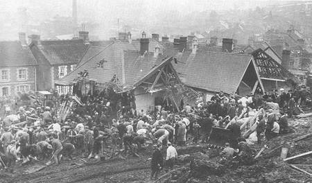 阿伯方悲。ú擅盒〈迩f阿伯方倒塌) 1966年10月20日上午9時(shí)30分,英國(guó)默瑟蒂德菲爾附近的威爾士采煤小村莊阿伯方發(fā)生了一場(chǎng)悲劇,一座被遺棄的礦渣山倒塌,把鄉(xiāng)村小學(xué)掩埋了。這場(chǎng)災(zāi)難使147人喪生,實(shí)際上該村整整一代的小學(xué)生都不存在了。 坍塌事件發(fā)生時(shí),孩子們正在集合,準(zhǔn)備參加早會(huì)。幾秒鐘內(nèi),潘特格拉斯幼兒園暨小學(xué)連同周圍的樓房就被掩埋在200萬(wàn)噸礦渣、石頭和煤泥底下。這所學(xué)校本來(lái)從中午起就將期中放假。 搶救工作整天都在進(jìn)行,并持續(xù)了一夜。2000名以上的警察、消防隊(duì)員、民防工作者以及志愿人員在礦渣中挖了一條45英尺長(zhǎng)的通道,找出尸體并搜尋幸存者。當(dāng)?shù)谝慌w被陸續(xù)抬出來(lái),整個(gè)悲劇的真相開始變得明朗時(shí),那些麻木得心腸變硬的記者和警察也情不自禁地痛哭流淚了。母親和祖母?jìng)兛罩p手用指尖抓扒礦渣堆,附近礦井里的礦工們拋下活前來(lái)支援搶救工作。首相和愛丁堡公爵飛到出事現(xiàn)場(chǎng),向死難孩子的家屬表示慰問。 10月27日,10萬(wàn)人參加了為死難孩子舉行的第一次葬禮。81具小棺材被埋入了山坡公墓的兩排長(zhǎng)長(zhǎng)的泥坑里。這些墳?zāi)股洗A⒅粋(gè)高100英尺、由花圈組成的十字架。當(dāng)葬禮上誦讀禱文時(shí),英國(guó)全國(guó)降半旗志哀。
