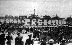 1957年國(guó)慶節(jié)時(shí),舉著“把反右派斗爭(zhēng)進(jìn)行到底”巨幅標(biāo)語(yǔ)的游行隊(duì)伍。