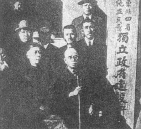 偽“東北四省純正民意獨立政府建設研究會”成立。中坐者為會長溥偉,右為日本顧問安谷少校