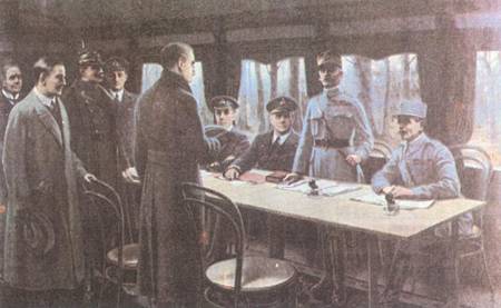 1918年11月11日,德國(guó)政府代表埃爾茨貝格爾同協(xié)約國(guó)聯(lián)軍總司令福煦在法國(guó)東北部貢比涅森林的雷東德車(chē)站簽署停戰(zhàn)協(xié)定,德國(guó)投降。根據(jù)協(xié)定,德國(guó)在15天內(nèi)從法、比、盧、阿爾薩斯- -洛林及萊茵河左岸地區(qū)全部撤軍,同時(shí)從土、羅、奧匈帝國(guó)及非洲撤軍,并交出5千門(mén)大炮、2萬(wàn)5千挺機(jī)槍、3千門(mén)迫擊炮、1 千7百架飛機(jī)、5千臺(tái)火車(chē)機(jī)車(chē)、15萬(wàn)節(jié)車(chē)皮和5千輛卡車(chē)。六小時(shí)后停火生效。《貢比涅森林停戰(zhàn)協(xié)定》的簽訂,宣告德、奧、土、保同盟國(guó)集團(tuán)的徹底戰(zhàn)敗,第一次世界大戰(zhàn)至此結(jié)束。