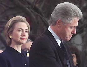 1998年12月19日美國眾議院舉行全體會議,以簡單多數(shù)通過了彈劾總統(tǒng)克林頓的兩條理由——在與其有關(guān)的緋聞案中“作偽證”和“妨礙司法”。克林頓從而成為美國歷史上第二位遭彈劾的總統(tǒng)。這是眾院表決后,克林頓在白宮前發(fā)表講話表示不會辭職,將尋求一妥協(xié)辦法完成任期。 12月19日是美國歷史上充滿戲劇性和令人難忘的一天。一如人們預(yù)料,美國眾院經(jīng)過一天半的激烈辯論后,最后以簡單多數(shù)通過對克林頓的兩項彈劾條款。 兩天來,國會眾院圍繞該不該彈劾克林頓這一問題,共和、民主兩黨的400多名眾議員們輪流登臺,唇槍舌劍。共和黨議員堅持克林頓與萊溫斯基的關(guān)系已不是“個人的行為”,“彈劾是憲法賦予我們的權(quán)力”。民主黨議員則反駁說,克林頓的過錯構(gòu)不成彈劾罪,共和黨這樣做是想搞“政變”。辯論歸辯論,投票才是關(guān)鍵。眾院全體議員星期六下午1時左右開始就彈劾克林頓的4項條款逐一投票。共和黨議員在眾院占多數(shù),投票結(jié)果可想而知。除1名民主黨議員因病沒有投票外,其余434名眾議員都參加了投票。結(jié)果,眾院以228對206票通過了彈劾克林頓的第1條款。該條款指控克林頓今年8月就萊溫斯基案向大陪審團(tuán)作偽證。在投票中共和黨及民主黨各有5名議員倒戈。眾院還以221對212票通過了指控克林頓妨礙司法調(diào)查的第3項彈劾條款。指控克林頓在瓊斯案中作偽證的第2項彈劾條款及指控克林頓濫用職權(quán)向國會說謊的第4項彈劾條款則分別以229對205票及285對148票被否決。隨著第1、3項彈劾條款在眾院的通過,克林頓成為繼安德魯-約翰遜總統(tǒng)之后第2位被眾院彈劾的總統(tǒng)。由于約翰遜是接任被刺殺的林肯的總統(tǒng)位置,因此,克林頓事實上是美國歷史上第1位被眾院彈劾的民選總統(tǒng)。 與相對平靜的眾院彈劾表決相比,反對和支持彈劾的兩個陣營在彈劾表決前卻有一系列驚人的戲劇表演。首先,第一夫人希拉里星期六一早前往國會山,趕在眾院辯論之前和支持克林頓的民主黨議員舉行了一場動情的懇談會,希望他們繼續(xù)支持克林頓及完成民主黨的事業(yè)。在會談中,希拉里談到了她和克林頓的感情生活,表示“我深深愛著和關(guān)心我的丈夫”。她認(rèn)為共和黨所主導(dǎo)的彈劾調(diào)查是“不公正的”。如果說希拉里為丈夫游說國會是預(yù)料中的事的話,那么,下屆眾議長利文斯頓在今天突然宣布辭去該職則讓兩黨議員和白宮驚愕不已。兩天前,在眾院開始彈劾辯論前,利文斯頓就扔出了一個“炸彈”,對外公開承認(rèn)在自己33年婚姻旅途中曾經(jīng)“偏離和迷失過”。他今天表示他已不再適合領(lǐng)導(dǎo)眾院,所以決定辭職。更引人注目的是他要求克林頓能像他一樣辭職下臺,“我必須樹立一個我希望克林頓總統(tǒng)能學(xué)習(xí)的榜樣”。利文斯頓的辭職對克林頓造成什么樣的壓力尚難判斷,但利文斯頓成為因丑聞而倒下的又一個政治人物給華盛頓的政治氛圍將帶來不小的影響。星期六出現(xiàn)的第三個插曲是,當(dāng)共和黨控制的眾院拒絕了民主黨再次提出的“懲戒”克林頓的替代方案并開始彈劾投票時,兩百多名民主黨眾議員在少數(shù)黨領(lǐng)袖格普哈特的率領(lǐng)下走出國會大廈以表示對共和黨的不滿和抗議,共和、民主兩黨的政治斗爭被形象地展現(xiàn)出來。 克林頓沒有收看眾院對其彈劾表決的經(jīng)過,當(dāng)時他在橢圓型辦公室和自己的牧師一道在祈禱。是白宮辦公廳主任波德斯塔及另一名高級助手將眾院通過第1彈劾條款的消息通知他的,克林頓當(dāng)時是在自己的小書屋里?肆诸D的牧師說,“他非常自信事情會過去的,但他很疲憊。”波德斯塔回憶說:“那是一個肅靜的時刻,他在反思。”第一夫人希拉里當(dāng)時則和女兒切爾希在一起,在白宮官邸度過那折磨人的一段時間。在眾院完成彈劾表決后,克林頓和夫人希拉里手挽手來到白宮南草坪,在民主黨議員的簇?fù)硐拢肆诸D發(fā)表了被彈劾后的第一次公開講話。他講話時的情緒是很平靜的。他首先感謝民主黨議員及少數(shù)共和黨議員以及美國老百姓對他本人、家庭及其政府的支持。他表示,他對其私生活所犯的錯誤已承擔(dān)責(zé)任,也邀請國會議員與其一道尋找一個“合理、兩黨一致的和相稱的”處罰,但這個方式被眾院共和黨人拒絕了,希望參院能接受。他希望這個問題在參院能盡快地以“符合憲法的和公平的方式得到解決”。他特別強(qiáng)調(diào),“我們一定要停止毀滅個人的政治游戲”?肆诸D在講話中再次排除了自愿辭職下臺的可能。他說,他希望繼續(xù)努力為美國人民服務(wù),直至“我任期的最后一天的最后一個小時”。在參院彈劾審判之前,克林頓最擔(dān)心的是要求其辭職的呼聲會越來越大,不過,從克林頓被眾院彈劾后的最新民調(diào)結(jié)果來看,克林頓可以松一口氣,美國一半以上的民眾仍希望克林頓繼續(xù)干完總統(tǒng)任期,對他工作持滿意的民眾仍高達(dá)61%。 克林頓被眾院彈劾并不意味克林頓已被趕出白宮。事實上,眾院通過的對克林頓的兩條彈劾條款僅是對克林頓的指控。根據(jù)美國憲法,美國會參院將舉行審判會,對指控作最后的裁決。參院的審判和美國的刑事審判相似,審