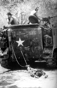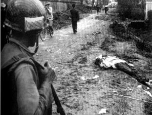 越南戰(zhàn)爭的創(chuàng)傷:暴尸街頭。 1967年2月26日,在美國發(fā)動越南戰(zhàn)爭以來最大的攻勢中,美國部隊開進柬埔寨邊界附近的叢林地區(qū),以搜尋秘密的越共總部。25,000多人進入一個位于柬埔寨附近稱作c作戰(zhàn)區(qū)的扇形地帶執(zhí)行戰(zhàn)爭任務(wù)。他們的任務(wù)是找到并摧毀越共中央機關(guān)總部——南越所有造反者的指揮所。同時,美國海軍的飛機開始向北越南部的河流里投放水雷以阻止帆船運輸。約翰遜總統(tǒng)強調(diào)指出:他不會停止轟炸北越,除非河內(nèi)減少它的軍事行動。