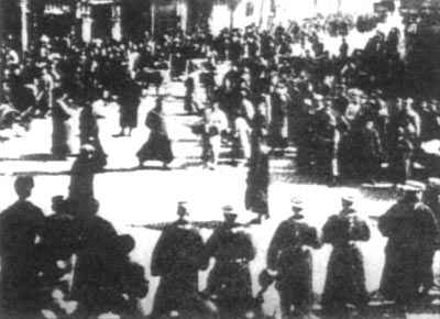 工人、學(xué)生和市民在老西門一帶與軍警對峙 1927年2月22日,上海工人舉行第二次武裝起義。上海工商學(xué)各界和共產(chǎn)黨、國民黨代表于22日成立“上海市民臨時革命委員會”,當(dāng)天下午4時,中共上海區(qū)委發(fā)出特別緊急通告,動員上海市民在傍晚6時暴動。起義的炮聲響后,各區(qū)工人糾察隊立即襲擊軍警,與敵人展開巷戰(zhàn),上海工人第二次武裝起義達(dá)到了高潮,迫切需要北伐部隊援助的時候,蔣介石卻命令進(jìn)軍嘉興的白崇禧部停止進(jìn)攻上海,鈕永建方面也按兵不動,袖手旁觀,致使工人武裝陷于孤軍奮戰(zhàn)的困境。在帝國主義和反動軍閥的殘酷鎮(zhèn)壓下,“上海市臨時革命委員會”決定立即停止第二次武裝起義。