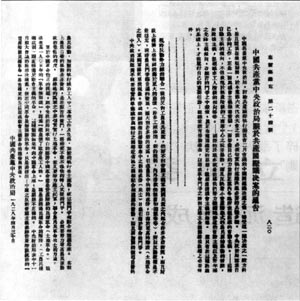 中共中央為接受共產(chǎn)國(guó)際決議案所發(fā)的通告 1928年2月9日,共產(chǎn)國(guó)際執(zhí)委會(huì)在莫斯科召開(kāi)第九次擴(kuò)大全會(huì),27個(gè)國(guó)家的92名代表參加。中國(guó)代表向忠發(fā)、李震瀛出席會(huì)議。會(huì)上,中國(guó)問(wèn)題被列為主要議程之一,并設(shè)立了中國(guó)委員會(huì)。 會(huì)議最后通過(guò)了《關(guān)于中國(guó)問(wèn)題的決議案》,批評(píng)了中共的左傾盲動(dòng)主義錯(cuò)誤。4月30日,中共中央政治局接受了這一決議案。