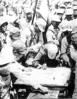 中國(guó)第五軍士兵在誓殺倭寇的決心書(shū)上簽名 1932年2月4日,鹽澤幸一撤職后,日軍第三艦隊(duì)司令官野村吉三郎中將接任上海日軍總指揮,并調(diào)植松煉磨少將為海軍陸戰(zhàn)隊(duì)指揮官。同時(shí),日本陸軍中央部調(diào)派陸軍第九師和混成第二十四旅增援上海作戰(zhàn)。 增援上海的日軍混成第二十四旅,于2月6日在佐世保集中啟航。駛向吳淞口。為掩護(hù)該部登陸。日本上海陸戰(zhàn)隊(duì)在植松少將指揮下,從7日7時(shí)50分開(kāi)始,集中全力進(jìn)攻吳淞,日軍先以飛機(jī)10架,沿淞滬鐵路線轟炸中國(guó)守軍陣地,繼以陸戰(zhàn)隊(duì)猛攻吳淞地區(qū)中國(guó)守軍第一五六旅第四團(tuán)陣地。同時(shí)集中軍艦24艘、火炮30余門(mén)、飛機(jī)20余架,對(duì)蘊(yùn)藻浜車(chē)站、吳淞鎮(zhèn)、獅子林炮臺(tái)實(shí)施轟擊,配合地面進(jìn)攻,守軍浴血抗擊,戰(zhàn)至12時(shí),將日軍擊退。 8日拂曉,日軍混成第二十四旅分三路向張華浜、蘊(yùn)藻浜、吳淞鎮(zhèn)進(jìn)攻。日海軍司令部發(fā)言人于10時(shí)向美駐滬記者揚(yáng)言,日軍決心在午前占領(lǐng)吳淞。至傍晚,日軍攻擊達(dá)10余次,均遭失敗。23時(shí)許,日軍向引翔港、楊樹(shù)浦、狄思威路退卻。日軍在進(jìn)攻吳淞的同時(shí),以一部兵力在紀(jì)家橋偷渡,企圖襲擊守軍后路,被守軍發(fā)覺(jué)擊退。另以一部兵力向八字橋、江灣進(jìn)攻,企圖攻占江灣、大場(chǎng),截?cái)鄥卿潦剀娕c閘北之間的聯(lián)系,亦未得逞。 10日,中目守軍第一二二旅第六團(tuán)由劉家行進(jìn)至楊家行,防守胡害莊沿蘊(yùn)藻浜北岸至吳淞之線。請(qǐng)纓赴援的張治中第五軍第八十六師第二六一旅于12日由南翔進(jìn)至嘉定,并派一個(gè)團(tuán)接替羅店第一二二旅第四團(tuán)之防務(wù)。 11日.野村對(duì)西方記者宣稱(chēng):“日軍渡過(guò)蘊(yùn)藻浜之日,即為日軍行動(dòng)終止之時(shí)。”“日軍在吳淞踏平華軍壕溝之日,為時(shí)不遠(yuǎn),請(qǐng)諸君拭目相觀,屆時(shí)即可結(jié)束華東之抵抗”。12日,日軍混成第二十四旅為在蘊(yùn)藻浜北岸奪取進(jìn)攻吳淞的支撐點(diǎn),兩度在紀(jì)家橋附近架橋,均遭失敗。12日晚,日軍利用夜暗在紀(jì)家橋附近架橋成功。13日拂曉,日軍在煙幕彈掩護(hù)下強(qiáng)渡蘊(yùn)藻浜,在曹家橋附近突破守軍防線,第十九路軍急調(diào)第六十師第一二二旅增援,將渡河日軍包圍。日軍數(shù)次突圍均遭失敗,雙方展開(kāi)肉搏格。被圍日軍在其救援部隊(duì)接應(yīng)下拼力突圍,但僅有少數(shù)突圍后被救援部隊(duì)收容后撤,大部被殲。同日,日軍在江灣、閘北地區(qū)亦以一部兵力進(jìn)攻。14日拂曉,日軍再各以一部兵力分別進(jìn)攻江灣、八字橋、青云路、天通庵路等處,均被守軍擊退。至此,日軍已無(wú)力組織新的進(jìn)攻,被迫原地固守待援,并在英、美、法、意等國(guó)公使出面調(diào)停下,再次處于休戰(zhàn)狀態(tài)。野村企圖從幾路包抄吳淞中國(guó)守軍的計(jì)劃,終被粉碎。