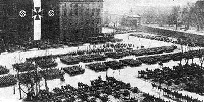 希特勒描繪《凡爾賽條約》,在梅林舉行盛大閱兵展覽 1935年3月31日, 歐洲的局勢變得更加復雜動蕩了。30日,俄英雙方官員舉行了會議,使這個多事的月份達到了高潮。 3月l日, 德國總理阿道夫-希特勒在薩爾受到最熱烈的歡迎,那一天是薩爾從法國移交給德國的日子。人們在歡迎儀式上希望這塊領土的移交將有助于緩和歐洲日益增長的緊張局面。然而,那天薩爾布呂肯一點兒也不平靜,當元首稱興高采烈的慶祝者為“我的薩爾人”時,他們高興得欣喜若狂。 3天之后,英國宣布了一條新的加強防務的政策。一份由首相拉姆齊-麥克唐納簽署的白皮書說,由于德國具有“侵略意識”和“整個世界……武裝力量日益增強”,英國的防御需要加強。 16日,當第三帝國宣布將重建軍隊征兵制時,英國又增長了對德國的憂慮。這一行動違反了《凡爾賽條約》的軍事條款部分。然而德國報紙對此用《凡爾賽條約結束了,德國重獲自由》為標題公布這條恢復征兵制的法令說,“只有通過重建德國軍隊,德國人民才能在槍炮林立的歐洲保衛(wèi)自己。”像人們所預料的那樣,反響是多種多樣的,大多數的大國都感到惴惴不安。法國感到泄氣但并不感意外, 英國感到憤怒但愿意派外長約翰-西蒙到柏林進行談判;而表面緘默的日本對德國軍國主義的復活感到高興。 一周之后,墨索里尼步其后塵擴充征兵,將1911年的畢業(yè)學生包括在內, 到下月這個時候,意大利將有100萬武裝士兵可供作戰(zhàn)。許多歐洲人對黑索里尼的動機還不太清楚。