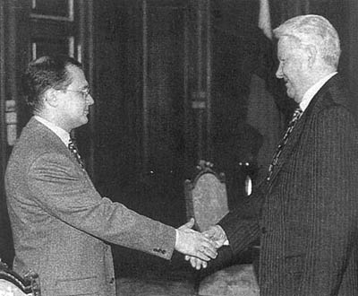 1998年3月23日, 俄羅斯總統(tǒng)葉利欽簽署命令,宣布解散俄政府,解除總理切爾諾梅爾金、第一副總理丘拜斯和副總理兼內(nèi)務部長庫利科夫的職務,理由是俄政府“缺乏活力,缺乏主動精神及新思想和新方法,沒有解決一系列重要的社會經(jīng)濟問題”。 同日,葉利欽任命原燃料和動力部長基里延科(左)為第一副總理,代行總理職權(quán),幾天后又提名他為政府總理候選人。4月24日,俄國家杜馬經(jīng)過第三次表決,批準35歲的基里延科為政府總理。 同年8月23日,葉利欽解散基里延科政府,俄政府再次更迭。 基里延科1962年7月27日生于蘇呼米市, 1984年畢業(yè)于高爾基水運工程學院,曾任下諾夫戈羅德市一家大銀行行長。1997年以來,先后出任俄燃料和動力部第一副部長、部長,并從當年12月開始擔任政府駐俄天然氣工業(yè)公司委員會主席。