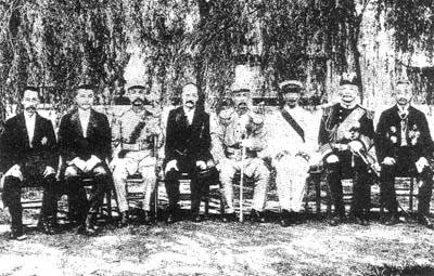 段祺瑞內閣成員合影。右起:曹汝霖(交通兼財政總長)劉冠雄(海軍總長)、陸徵祥(外交總長)、段祺瑞(國務總理)、錢能訓(內務總長)、段芝貴(陸軍總長)、朱深(司法總長)、傅增湘(教育總長) 1918年3月23日,段祺瑞復任國務總理,并著手第三次組閣。 北軍占岳陽,皖系主戰(zhàn)派為之一振。19日,以曹輥為首、包括長江三督在內的15省三特區(qū)督軍聯(lián)名通電,要求段祺瑞組閣。馮國璋被迫請段出山,段表示不干。20日晚,日本公使林權助訪徐世昌,勸段祺瑞復出組閣。段祺瑞又以勝利者姿態(tài)出山。 23日,任段祺瑞為國務總理的命令發(fā)表,宣告了王士珍內閣的解體。29日,段祺瑞第三次組閣,任命外交總長,陸徵祥;內務總長,錢能訓;陸軍總長,段芝貴;海軍總長,劉冠雄;教育總長,傅增湘;司法總長,朱深;農商總長,田文烈;交通意長兼財政總長,曹汝霖。這次內閣未經(jīng)國會通過。