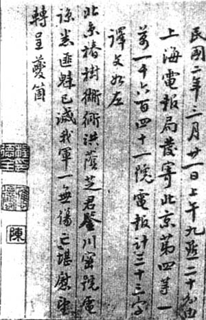 應(yīng)夔丞向洪述祖報(bào)告刺宋任務(wù)已完成的密電