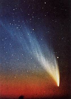 1976年3月21日,本世紀(jì)最漂亮的彗星--威斯特彗星離開地球。 1975年11月5日,由德國天文學(xué)家威斯特從歐洲南方天文臺(tái)所拍攝的底片中檢測出來,預(yù)報(bào)1976年2月25日過近日點(diǎn)時(shí)可成為肉眼可見的彗星。實(shí)際上,彗星過近日點(diǎn)前幾天即已達(dá)到-1等亮度,彗尾粗短,在黃昏的霞光中可見,隨即西落。 2月25日當(dāng)它過近日點(diǎn)后17小時(shí),達(dá)到空前的亮度-3等,肉眼可見10分鐘,方才西落,成為本世紀(jì)第四顆在白晝?nèi)庋劭梢姷腻缧恰?月5日至7日,彗尾達(dá)30度~50度,彗頭達(dá)1等亮度,彗尾很寬,兩條彗尾--筆直的氣體彗尾和呈白色、扇形的塵埃彗尾清晰可辨。威斯特彗星比預(yù)期的更為燦爛,成為本世紀(jì)最為美麗的大彗星。 天文學(xué)家用望遠(yuǎn)鏡發(fā)現(xiàn),彗核于3月5日分裂為2塊,3月10日至11日又進(jìn)一步分裂為4塊,其中一塊于3月21日消失。此彗星,全部具備條件1~5。