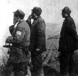 西北野戰(zhàn)軍指揮員彭德懷(左二)、習(xí)仲勛(左三)等在青化砭戰(zhàn)役的前沿陣地上