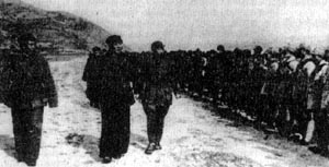 1944年,毛澤東、朱德、王震在延安機場檢閱南下的359旅