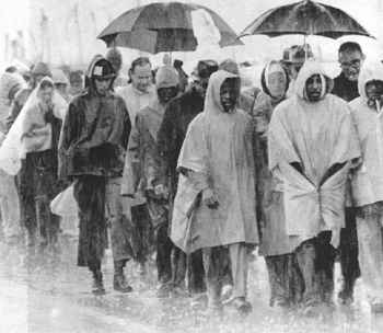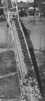 馬丁-路德-金(前排中)走在游行隊(duì)伍中 1965年初,美國(guó)爭(zhēng)取黑人民權(quán)的斗爭(zhēng)進(jìn)人了一個(gè)新階段。 1964年約翰遜總統(tǒng)提出《民權(quán)法》后,馬丁-路德-金把運(yùn)動(dòng)的重點(diǎn)放在亞拉巴馬州塞爾馬城黑人選民登記問題上。在該城14000名黑人居民中只有335人被登記,增加登記人數(shù)的嘗試遭到地方當(dāng)局的阻止。 1965年3月7日,一支黑人抗議的游行隊(duì)伍向州首府蒙哥馬利進(jìn)發(fā), 州軍隊(duì)執(zhí)行喬治-華萊士州長(zhǎng)的命令,以暴力驅(qū)散了游行隊(duì)伍,其中一名示威者被殺。兩星期后,約翰遜將國(guó)民警衛(wèi)隊(duì)置于聯(lián)邦政府管轄下,向金親自率領(lǐng)的和平游行隊(duì)伍提供保護(hù)。 25000人冒著清晨的蒙蒙細(xì)雨在塞爾馬集合,步行52英里來到蒙哥馬利,金在那里向群眾發(fā)表了講話。  游行隊(duì)伍在行進(jìn)中