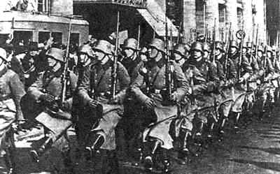 首批德國(guó)步兵耀武揚(yáng)威地開進(jìn)科隆 1936年3月7日,希特勒在德國(guó)重新實(shí)行義務(wù)兵役制幾乎一年了。今天他的軍隊(duì)派上了用場(chǎng)!他們跨過萊茵河,開進(jìn)了被認(rèn)為是非軍事區(qū)的萊茵區(qū)。 為了使德軍與其宿敵法軍脫離接觸,凡爾賽和約和洛迦諾公約規(guī)定,德國(guó)境內(nèi)萊因河以東50公里為非軍事區(qū)。如德軍進(jìn)入,法軍有權(quán)采取軍事行動(dòng),英國(guó)則有義務(wù)以武裝力量支持法國(guó)。 萊因蘭是德國(guó)的疆土,但德軍卻不能進(jìn)入。:希特勒決定給軍隊(duì)順順氣。1936年3月2日,他瞞著眾人,命令3個(gè)營(yíng)的德軍越過萊因河,向邊境城市亞琛挺進(jìn)。這是一次押寶,他為此有一道補(bǔ)充命令:如果法軍作出反應(yīng),德軍則即刻從原路撤回,結(jié)果,法國(guó)人沒有做出軍事反應(yīng)。 這次冒險(xiǎn)成功了,希特勒這才向全體國(guó)會(huì)議員宣布:德國(guó)士兵開過了萊因河!議員們涼呆了,當(dāng)時(shí)法國(guó)有100個(gè)師卻無奈于3個(gè)營(yíng)的德軍: 就憑著這一點(diǎn)黷武精神涌上了腦袋,他們狂熱地向新的救世主歡呼起來。 德國(guó)人曾經(jīng)異常厭惡希特勒的匪徒式統(tǒng)治,但為時(shí)不久,希特勒的個(gè)人威望卻達(dá)到了高峰。德國(guó)資產(chǎn)階級(jí)和容克地主認(rèn)為他們終于找到了一個(gè)合適的人。這個(gè)人曾聲名狼籍,而且來路不正,但他以邪惡的天才毀滅了魏瑪共和國(guó),廢除了協(xié)約國(guó)1919年的判決,對(duì)凡爾賽和約不屑一顧,正以軍事力量恢復(fù)德國(guó)在世界上的地位,并有望為歷史帶來一個(gè)“德國(guó)時(shí)辰”。 德國(guó)人在歡呼時(shí),偏偏忘記了,希特勒完全有可能把德國(guó)引向毀滅。而這個(gè)魔鬼卻下決心沿著這條道走到黑。 他曉諭歡呼的人群說:“我們決不投降——不!決個(gè)!我們也許會(huì)毀滅,但當(dāng)我們要?dú)绲臅r(shí)候,就會(huì)把整個(gè)世界捆在一起--一同跳入火坑!  當(dāng)我毀滅的時(shí)候,會(huì)把整個(gè)世界捆在一起
