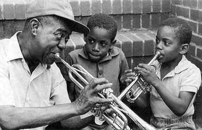 圖為他去世前一年,在紐約皇后區(qū)的寓所門口與鄰居 小孩一起即興吹奏。男孩吹奏的玩具小號,是阿姆斯特朗 不久前往院治療時護士贈送的禮物。