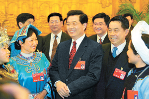 3月6日,中共中央總書記胡錦濤參加了十屆全國(guó)人大一次會(huì)議貴州代表團(tuán)的審議。這是胡錦濤同志與代表們親切交談