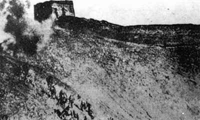 日軍在爬坡,進(jìn)攻古北口 1933年3月4日,日軍占領(lǐng)承德后,即以第八師主力向古北口方向追擊。 東北軍王以哲部第一0七師,在古北口外的老虎山和黃土梁一帶, 與追擊日軍激戰(zhàn)兩晝夜后于3月9日撤至關(guān)內(nèi)。王以哲急調(diào)第一一二師沿長(zhǎng)城以北布防,準(zhǔn)備與中央軍第十七軍共同防御古北口, 此時(shí)尾追第一0七師的日軍已進(jìn)抵長(zhǎng)城附近。第十七軍第二十五師關(guān)麟征部于3月10日4時(shí)抵達(dá)古北口。 10日15時(shí),日軍第八師一部在炮火掩護(hù)下,作寬正面的試探性進(jìn)攻,數(shù)小時(shí)后退回原線。