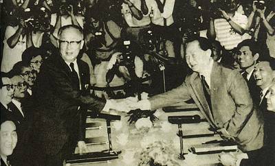 海協(xié)會會長汪道涵(右)與臺灣;鶗麻L辜振甫(左)具有歷史意義的握手 備受世人矚目的“汪辜會談”于1993年4月27日至28日在新加坡舉行。這是海峽兩岸授權民間機構領導人的第一次晤談,晤談的雙方分別為海峽兩岸關系協(xié)會會長汪道涵和臺灣的海峽交流基金會董事長辜振甫。 海峽兩岸關系協(xié)會成立于1991年12月16日,它以促進海峽兩岸交往,發(fā)展兩岸關系,實現(xiàn)祖國和平統(tǒng)一為宗旨。首任會長汪道涵曾任上海市市長,榮毅仁出任海協(xié)會名譽會長。海協(xié)成立一年多來,為促進海峽兩岸的交往交流做了大量工作。1992年一年便促成了兩岸新聞、文化、科技界和兩岸青年、少年兒童的雙向交流,協(xié)助處理了兩岸漁民的海上糾紛,并為推動兩岸商貿(mào)往來作出了努力。與臺灣;鶗M行的關于兩岸公證書使用、查詢和開辦掛號函件查詢、補償事宜的首個事務性商談也已草簽協(xié)議。 臺灣海峽交流基金會成立于1990年11月21日,在1991年3月9日正式掛牌工作。據(jù)臺灣方面聲稱,成立這個機構是為了既堅持與大陸“不接觸、不談判、不妥協(xié)”的“三不政策”,又能面對兩岸交往中衍生的問題需要兩岸協(xié)商解決的現(xiàn)實。作為臺灣方面負責兩岸交流的“民間中介機構”,;鶗7億元新臺幣的基金里,官方撥款占5.2億元,另1.8億元由臺灣一些民間企業(yè)捐助。;鶗兹味麻L辜振甫是前國民黨中常委,臺灣工業(yè)總會理事長。 海協(xié)一年來為促成“汪辜會談”的早日實現(xiàn)作了積極努力。1992年1月8日,成立不久的海協(xié)致函邀請臺灣海基會董事長、副董事長、秘書長率團來訪。8月4日,汪道涵會長再次向辜振甫先生發(fā)出邀請,希望“就當前經(jīng)濟發(fā)展、兩會會務問題,交換問題,洽商方案。”8月22日,辜振甫正式回函接受邀請。從那時起,“汪辜會談”逐漸成為兩岸輿論界的熱門話題,被認為是“兩岸跨出正式會談的第一步”。此后,兩會為商議此一會談電函往來不斷,經(jīng)過半年多的醞釀和準備,1993年4月8日至10日,臺灣;鶗倍麻L兼秘書長邱進益訪問北京,海協(xié)與;鶗e行了“汪辜會談”預備性磋商,確定了“汪辜會談”的主要議題: 會談中,海峽兩岸關系協(xié)會會長汪道涵和臺灣海峽交流基金會董事長辜振甫就加強兩岸經(jīng)濟合作和科技文化交流及兩會會務問題進行了磋商,在許多方面達成了共識,并于4月29日上午簽署了《汪辜會談共同協(xié)議》、《兩岸公證書使用查證協(xié)議》、《兩岸掛號函件查詢、補償事宜協(xié)議》和《兩會聯(lián)系與會談制度協(xié)議》四項文件,取得了雙方滿意的結果。這次會談標志著海峽兩岸關系邁出了歷史性的、重要的一步,它對于推動兩岸關系的深入發(fā)展,促進祖國和平統(tǒng)一,起到積極的作用。