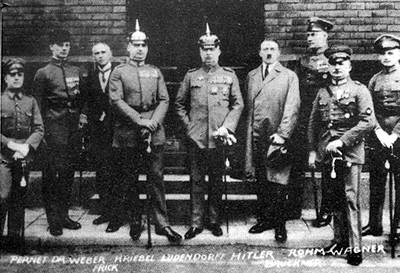 右四希特勒,右五納粹同黨魯?shù)堑婪驅(qū)④?br />右六為政變的軍事指揮克里布爾中校 1919年,希特勒加入德國(guó)工人黨,1920年4月1日,把德國(guó)工人黨改組為國(guó)家社會(huì)主義德國(guó)工人黨(簡(jiǎn)稱納粹黨或國(guó)社黨),自任黨魁;1921年,糾集一伙法西斯暴徒組織沖鋒隊(duì);1923年11月8日,他組織了奪取巴伐利亞政權(quán)的陰謀活動(dòng)(即啤酒館政變),啤酒館政變失敗后,希特勒被判刑5年,而實(shí)際上只在蘭茨貝格監(jiān)獄時(shí)服刑264天,并且舒適而自由地住在一間小牢房里。在服刑期間,希特勒口述、由他的忠實(shí)黨徒莫里斯和魯-赫斯筆錄成書(shū)。1924年首次發(fā)出廣告,書(shū)名冗長(zhǎng),題名為《四年半來(lái)對(duì)謊言、愚蠢和膽怯的斗爭(zhēng)》,出版公司經(jīng)理馬-阿曼把這個(gè)累贅的書(shū)名改為《我的奮斗》。