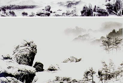 郎靜山《湖山攬勝》 「湖山攬勝」是郎靜山先生的得意之作。此照是山水集錦巨構(gòu),可說是郎大師運用國畫山水的構(gòu)圖方式,巧妙地運用在集錦作品上,從畫面最右邊的涼亭老翁遠眺層巒云霧,到近景的奇石叢樹,左邊的孤舟,遠處的村落及湖邊倒影,這幅美麗的國畫山水景像,就如同大師一生胸襟開朗,寧靜與世無爭。此幅大師一生最后遺作及集錦攝影精華的完結(jié)篇,甚具歷史與攝影藝術(shù)史上雙重意義。