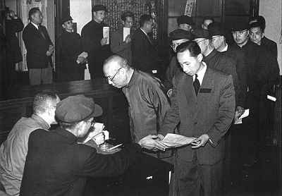 上海黃浦區(qū)國(guó)際貿(mào)易業(yè)的資本家排 隊(duì)向“五反”委員會(huì)遞交坦白書(shū)