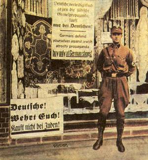 抵制猶太人店鋪的告示還有站崗的沖鋒隊員 1933年4月1日,德國開始抵制猶太人運動。在德國眾多標(biāo)語牌晝夜懸掛,上面寫到:“世界各地的猶太人正在企圖扼殺新德國”,“德國人民,你要自衛(wèi)!不要買猶太人的東西!” 前些時候,希特勒還在為自己開脫抵制猶太人商店的運動的責(zé)任。官方解釋說這一行動是納粹市民的主意。當(dāng)昨晚希特勒的部長之一戈培爾博士發(fā)表強烈反對猶太人的講話,并對激動的聽眾說明抵制運動將如何有效時,這具騙局才被揭穿。 戈培爾聲稱抵制運動是暫時的。但是這位人民啟蒙宣傳部長卻威脅說直到世界各地的猶太人停止抵制德國貨物,并且停止譴責(zé)德國政府的暴行時,抵制猶太人的運動才能停止。