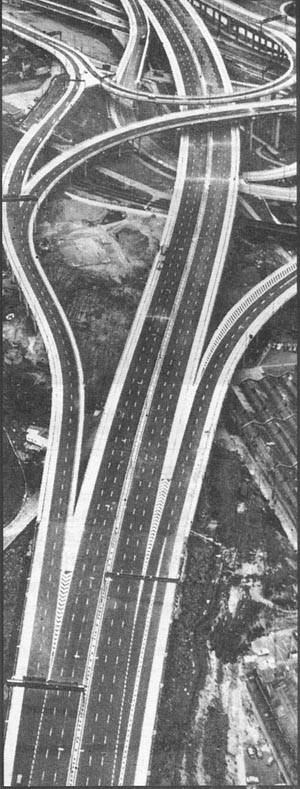 1972年5月24日,英國環(huán)境大臣彼得-沃爾克宣布蘭茲高速公路匯合處已經(jīng)開通。這使倫敦至蘇格蘭邊境的約300英里高速公路連為一體。這一最后的匯合處延伸達(dá)7英里,處于大巴爾與伯明翰附近的布魯姆威治城堡之間,包括格里夫里山附近的立交道口。這處復(fù)雜的立交橋在當(dāng)時創(chuàng)造了世界之最,由于它的形狀極像一盤纏雜交錯的意大利面條,因此,人們通常稱它為“意大利面條路口”。