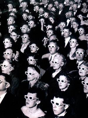 為了把觀眾從電視奪回來(lái),好萊塢推出了一種新玩藝兒--立體電影。戴著特殊眼鏡的觀眾像在觀看《布瓦那魔鬼》及《蠟屋》這類(lèi)驚險(xiǎn)片那樣,發(fā)現(xiàn)自己躲在逃跑的火車(chē)及魔鬼的后面。