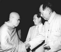 1958年6月30日,毛澤東主席接見(jiàn)胡達(dá)法師率領(lǐng)的柬埔寨佛教代表團(tuán)。中國(guó)佛教協(xié)會(huì)副會(huì)長(zhǎng)趙樸初(中)參加會(huì)見(jiàn) 中國(guó)人民政治協(xié)商會(huì)議第九屆全國(guó)委員會(huì)副主席、中國(guó)民主促進(jìn)會(huì)中央名譽(yù)主席、中國(guó)佛教協(xié)會(huì)會(huì)長(zhǎng)、著名的社會(huì)活動(dòng)家、杰出的愛(ài)國(guó)宗教領(lǐng)袖、中國(guó)共產(chǎn)黨的親密朋友趙樸初同志,因病于2000年5月21日在北京逝世,享年93歲。 趙樸初同志1907年11月5日生于安徽省太湖縣。早年就學(xué)于蘇州東吳大學(xué)。1928年后,任上海江浙佛教聯(lián)合會(huì)秘書(shū),上海佛教協(xié)會(huì)秘書(shū),“佛教凈業(yè)社”社長(zhǎng),四明銀行行長(zhǎng)。1938年后,任上海文化界救亡協(xié)會(huì)理事,中國(guó)佛教協(xié)會(huì)秘書(shū)、主任秘書(shū),上海慈聯(lián)救濟(jì)戰(zhàn)區(qū)難民委員會(huì)常委兼收容股主任,上海凈業(yè)流浪兒童教養(yǎng)院副院長(zhǎng),上海少年村村長(zhǎng)。1945年參與發(fā)起組建中國(guó)民主促進(jìn)會(huì)。1946年后,任上海安通運(yùn)輸公司、上海華通運(yùn)輸公司常務(wù)董事、總經(jīng)理。1949年任上海臨時(shí)聯(lián)合救濟(jì)委員會(huì)總干事,中國(guó)人民保衛(wèi)世界和平委員會(huì)常委、副主席,亞非團(tuán)結(jié)委員會(huì)常委。1950年后,任中國(guó)人民救濟(jì)總會(huì)上海市分會(huì)副主席兼秘書(shū)長(zhǎng),華東民政部、人事部副部長(zhǎng),上海市人民政府政法委員會(huì)副主任。1953年后,任中國(guó)佛教協(xié)會(huì)副會(huì)長(zhǎng)兼秘書(shū)長(zhǎng),中國(guó)作家協(xié)會(huì)理事,中日友好協(xié)會(huì)副會(huì)長(zhǎng)、中緬友好協(xié)會(huì)副會(huì)長(zhǎng),中國(guó)紅十字會(huì)副會(huì)長(zhǎng)、名譽(yù)副會(huì)長(zhǎng),中國(guó)人民爭(zhēng)取和平與裁軍協(xié)會(huì)副會(huì)長(zhǎng)。1980年后,任中國(guó)佛教協(xié)會(huì)會(huì)長(zhǎng),中國(guó)佛學(xué)院院長(zhǎng),中國(guó)藏語(yǔ)系高級(jí)佛學(xué)院顧問(wèn),中國(guó)宗教和平委員會(huì)主席,中國(guó)書(shū)法家協(xié)會(huì)副主席。 趙樸初同志曾任上海市政協(xié)委員、常委,上海市人大代表。他是第一、二、三、四、五屆全國(guó)人大代表。作為愛(ài)國(guó)宗教界的代表,他參加了中國(guó)人民政治協(xié)商會(huì)議第一屆全體會(huì)議,歷任第一、二、三屆全國(guó)政協(xié)委員,第四、五屆全國(guó)政協(xié)常委,第六、七、八屆全國(guó)政協(xié)副主席。 趙樸初同志是著名的社會(huì)活動(dòng)家,偉大的愛(ài)國(guó)主義者,是中國(guó)共產(chǎn)黨的親密朋友。他一生追求進(jìn)步、探索真理,孜孜以求,矢志不移。在近70年的漫長(zhǎng)歲月中,他與中國(guó)共產(chǎn)黨風(fēng)雨同舟,親密合作,為中國(guó)人民解放事業(yè)和社會(huì)主義建設(shè)事業(yè),為造福社會(huì)、振興中華,做出了不可替代的卓越貢獻(xiàn)。早在大革命時(shí)期,年輕的趙樸初同志親眼目睹在帝國(guó)主義的野蠻侵略下中華民族備受欺凌,在封建地主的殘酷剝削下廣大農(nóng)民蒙受苦難,從而立下救國(guó)救民的遠(yuǎn)大抱負(fù)。1937年上海“八·一三”抗戰(zhàn)后,他積極進(jìn)行抗日救亡宣傳活動(dòng),組織婦女支前,動(dòng)員和掩護(hù)300多名青壯年奔赴前線,千方百計(jì)地救濟(jì)、安置難民。上海淪陷后,他冒著生命危險(xiǎn),克服重重困難,積極與新四軍聯(lián)系,把經(jīng)過(guò)培訓(xùn)的千余名中青年難民,分批送往皖南新四軍總部,其后陸續(xù)送往蘇南、蘇北等地參加抗戰(zhàn)。1938年他參加了職業(yè)界救亡組織上海益友社并擔(dān)任理事長(zhǎng),參加了上海各界人士抗日統(tǒng)一戰(zhàn)線組織星二聚餐會(huì)及其核心組織星六聚餐會(huì),積極宣傳抗日主張,團(tuán)結(jié)愛(ài)國(guó)人士,開(kāi)展秘密斗爭(zhēng)?箲(zhàn)勝利后,趙樸初同志痛恨國(guó)民黨反動(dòng)獨(dú)裁的黑暗統(tǒng)治,積極參加爭(zhēng)取民主、反對(duì)內(nèi)戰(zhàn)、解救民眾的愛(ài)國(guó)民主運(yùn)動(dòng),迎來(lái)了上海的解放。50年代初期,新中國(guó)百?gòu)U待興。趙樸初同志在擔(dān)任華東民政部、人事部副部長(zhǎng)期間,為華東地區(qū)和上海的經(jīng)濟(jì)恢復(fù)和安定群眾生活做了大量工作。作為佛教協(xié)會(huì)副會(huì)長(zhǎng),趙樸初同志號(hào)召佛教徒與全國(guó)人民一道,緊密團(tuán)結(jié)在中國(guó)共產(chǎn)黨和人民政府周圍,為實(shí)現(xiàn)第一個(gè)五年計(jì)劃而奮斗。在民族危亡時(shí)刻,在新中國(guó)建立的過(guò)程中,趙樸初同志義無(wú)反顧地與中國(guó)共產(chǎn)黨和全國(guó)人民站到一起,同國(guó)家、民族的命運(yùn)緊密相連,展現(xiàn)了他熱愛(ài)祖國(guó)、熱愛(ài)人民、熱愛(ài)中國(guó)共產(chǎn)黨的高尚情操。 趙樸初同志是中國(guó)民主促進(jìn)會(huì)的創(chuàng)始人之一。1945年12月30日,趙樸初同志與馬敘倫、王紹鰲、林漢達(dá)、周建人、雷潔瓊等在上海成立以“發(fā)揚(yáng)民主精神,推進(jìn)中國(guó)民主政治之實(shí)現(xiàn)”為宗旨的政黨———中國(guó)民主促進(jìn)