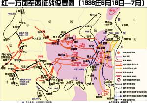 今天5月19號。1936年的今天,中國工農(nóng)紅軍第一方面軍發(fā)起西征戰(zhàn)役。在日本帝國主義的鐵蹄從東北逼進(jìn)華北的時候,中國共產(chǎn)黨把民族大義放在首位,敦促蔣介石共同抗日。5月初,紅軍東征回師后,中華蘇維埃政府和中央革命軍事委員會發(fā)表了《停戰(zhàn)議和一致抗日通電》,表示愿意與一切進(jìn)攻抗日紅軍的武裝隊伍,實行停戰(zhàn)議和,以達(dá)到停戰(zhàn)抗日的目的。但是,蔣介石堅持內(nèi)戰(zhàn)政策,拒絕議和,調(diào)集兵力準(zhǔn)備進(jìn)剿陜甘寧邊區(qū),并以寧夏馬鴻逵的部隊堵防紅軍西進(jìn)。中央軍委為擴(kuò)大和鞏固西北抗日根據(jù)地,擴(kuò)大紅軍,并開展抗日統(tǒng)一戰(zhàn)線工作,決定發(fā)起西征戰(zhàn)役。紅軍的西征隊伍分兩路進(jìn)行:以紅一方面軍第一、十五軍團(tuán)和第81師組成西方野戰(zhàn)軍,西征陜、甘、寧三省邊界地區(qū),打擊堅持反共的寧夏軍閥部隊,創(chuàng)建新的蘇區(qū);以部分紅軍和地方武裝由中央軍委副主席周恩來指揮,在東線堅持游擊戰(zhàn)爭,保衛(wèi)陜甘蘇區(qū),策應(yīng)西征作戰(zhàn)。5月19號,在彭德懷的指揮下,西野戰(zhàn)軍兵分三路,以紅一軍團(tuán)為左路軍,紅15軍團(tuán)為右路軍,從延長、延川地區(qū)西進(jìn),先后到達(dá)吳起鎮(zhèn)、新城堡等地集結(jié)。彭德懷根據(jù)寧夏軍閥部隊布防情況,右路軍作出西北移動的態(tài)勢,吸引環(huán)縣、慶陽的國民黨第35師回援寧夏;左路軍向西南方向行動,在運動中殲滅回援之?dāng)场kS后,右路軍占領(lǐng)同心城,在王家團(tuán)莊附近截斷了第35師的退路。同時,左路軍向曲子、環(huán)縣方向急進(jìn)。在此期間,紅29軍一部也進(jìn)至曲子,合水之間地區(qū),配合左路軍行動;紅28軍加入西方野戰(zhàn)軍序列,與第81師等部組成中路軍。左、中、右三路軍密切配合,先后攻占了定邊、王家團(tuán)莊、七營和豫旺堡等地,并在這里擊退了國民黨軍的數(shù)次反撲,鞏固和擴(kuò)大了占領(lǐng)地區(qū),新、老蘇區(qū)連成一片。7月底,西方野戰(zhàn)軍集結(jié)在豫旺堡地區(qū)休整,西征戰(zhàn)役勝利結(jié)束。西征戰(zhàn)役歷時兩個多月,俘虜國民黨軍2000多人,占領(lǐng)城鎮(zhèn)10多座,開辟了縱橫200多公里的新區(qū),推動了抗日民族統(tǒng)一戰(zhàn)線的發(fā)展,同時,也為后來策應(yīng)紅軍第二、四方面軍北上創(chuàng)造了條件。