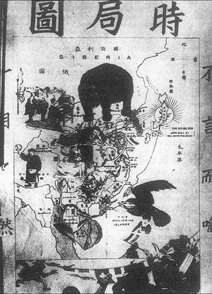 一位愛國(guó)人士畫的時(shí)局圖熊代表沙皇俄國(guó),虎代表英國(guó),腸代表德國(guó),哈蟆代表法國(guó),太陽代表日本國(guó),鷹代表美國(guó)