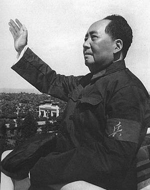 1966年8月18日毛澤東佩戴紅衛(wèi)兵袖章,在北京城樓首次檢閱紅衛(wèi)兵。