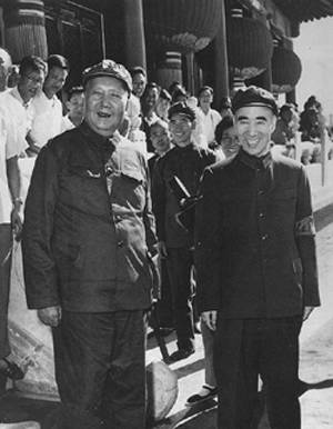 1966年夏,毛澤東、林彪在天安門城樓上 “通知”提出向黨、政、軍、文各界的“資產階級代表人物”開展徹底批判,奪取文化領域中的領導權。指混進黨里、政府里、軍隊里和文化界的資產階級代表人物,是一批反革命的修正主義分子,一旦時機成熟,他們就要奪取政權,把無產階級專政變?yōu)橘Y產階級專政。赫魯曉夫那樣的人物,現正睡在我們的身旁,各級黨委必須充分注意這一點。這些結論成為發(fā)動“文化大革命”的指導方針。