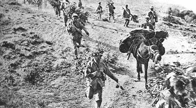 疾速向孟良崮移動的華東野戰(zhàn)軍 1946年5月16日,國民黨王牌軍五大主力之一的整編第七十四師被華東野戰(zhàn)軍全殲,師長張靈甫被擊斃。此役,俘虜國民黨軍19600人,斃傷13000人。