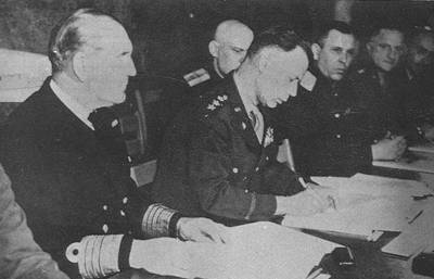 盟軍和德軍代表在《德國武裝部隊(duì)無條件投降議定書》簽字儀式上