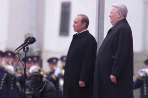 5月7日,俄羅斯總統(tǒng)普京在莫斯科大克里姆林宮宣誓就職。圖為普京就職后和前總統(tǒng)葉利欽一同檢閱總統(tǒng)警衛(wèi)團(tuán)。 俄羅斯當(dāng)選總統(tǒng)普京2000年5月7日中午在大克里姆林宮宣誓就職。莫斯科時(shí)間12時(shí)整,普京來到大克里姆林宮安德烈大廳,俄中央選舉委員會(huì)主席韋什尼亞科夫宣布了俄中央選舉委員會(huì)關(guān)于普京當(dāng)選總統(tǒng)的決定。隨后,俄聯(lián)邦憲法法院院長巴格萊請(qǐng)普京宣誓。俄羅斯前總統(tǒng)葉利欽把象征總統(tǒng)權(quán)力的標(biāo)志“祖國功勛”一級(jí)勛章交給普京并發(fā)表講話,他希望普京大膽工作,愛惜俄羅斯,把俄建設(shè)成新的國家,給俄人民帶來幸福和繁榮。普京在就職演說中說,他要保護(hù)好俄羅斯,捍衛(wèi)俄羅斯公民的利益,改善人民的生活。他將根據(jù)國家的利益規(guī)范自己的行為,將團(tuán)結(jié)全體俄羅斯人民,把俄羅斯建設(shè)成自由、繁榮、富強(qiáng)和文明的國家。普京講話后,大廳里奏起了俄國歌,克里姆林宮上空升起了總統(tǒng)旗幟,鳴禮炮30響。隨后,普京和葉利欽在教堂廣場(chǎng)共同檢閱了總統(tǒng)警衛(wèi)團(tuán)。前蘇聯(lián)總統(tǒng)戈?duì)柊蛦谭颍砹_斯憲法法院法官,聯(lián)邦委員會(huì)成員,國家杜馬成員及各國使節(jié)等1500人出席了就職儀式。普京是3月26日在俄羅斯總統(tǒng)選舉中以超過52%的選票當(dāng)選總統(tǒng)的。根據(jù)俄羅斯憲法,總統(tǒng)為國家元首兼武裝力量最高統(tǒng)帥,任期為4年。俄羅斯總統(tǒng)普京7日在就職儀式結(jié)束后,立即宣布任命政府第一副總理卡西亞諾夫?yàn)檎偫。俄總統(tǒng)新聞局向新聞界說,普京已經(jīng)簽署了任命卡西亞諾夫?yàn)檎偫淼拿睢?br />相關(guān)鏈接:普京談施政綱領(lǐng) 俄羅斯當(dāng)選總統(tǒng)普京6日強(qiáng)調(diào),進(jìn)一步發(fā)展民主制度和根本改善居民的物質(zhì)生活是他的施政綱領(lǐng)中的兩個(gè)重要觀點(diǎn)。據(jù)報(bào)道,普京在俄聯(lián)邦主體選舉委員會(huì)領(lǐng)導(dǎo)人會(huì)議上說,他在致俄議會(huì)的總統(tǒng)國情咨文中將全面闡述他的施政綱領(lǐng)。他指出,國家應(yīng)當(dāng)履行自己的社會(huì)義務(wù),給那些的確需要幫助的人們提供應(yīng)有的幫助。普京表示,他將大大強(qiáng)化國家政權(quán)體制。他主張加強(qiáng)國家建設(shè),大大加強(qiáng)權(quán)力機(jī)關(guān)的垂直聯(lián)系,解決維護(hù)法律方面的問題,完善總統(tǒng)辦公廳的工作。他說,應(yīng)當(dāng)充分發(fā)揮總統(tǒng)辦公廳、政府和其他國家權(quán)力機(jī)關(guān)的作用。普京指出,必須防止犯罪分子打入政權(quán)機(jī)關(guān)。
