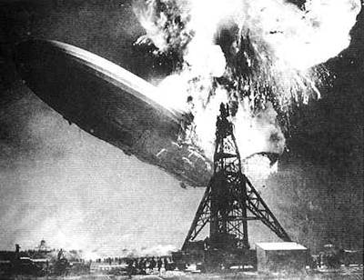 1937年5月6日,“興登堡”號飛艇在一場災(zāi)難性事故中被大火焚毀,97名乘客和乘務(wù)人員中至少有23人死亡。這艘大的飛艇正在新澤西州萊克赫斯特海軍航空總站上空準備著陸,僅花幾分鐘內(nèi)的時間就被燒毀,起火原因目前尚不清楚,不過人們認為它是由發(fā)動機放出的靜電或火花點燃了降落時放掉的氫氣所致。直到事故發(fā)生為止,“興登堡”飛艇已十次安全地往返于大西洋兩岸之間,共載客1002人次。 在最后這次飛行當(dāng)中,由于是在大西洋上空逆風(fēng)飛行,“興登堡”號遲到了12小時。它在東海岸上空緩慢飛行徐徐下降,以便在傍晚到達,因為這是降落的最佳時間。晚7時20分。飛艇擲下兩根著陸線,并準備著陸,這時長972英尺、重110噸的飛艇在離地面300英尺的空中,突然起火燃燒。地面上的人束手無策,眼睜睜地看著700萬立方英尺的氫氣囊?guī)缀趿⒓幢涣已嫱虥],燃著的骨架落地跌得粉碎。“興登堡”號在濃煙之中焚毀。經(jīng)過海軍人員和乘務(wù)人員奮勇努力,許多人被搶救出來。 另一種說法是地電通過系留繩索傳到艇身,使凝聚在氣囊蒙布上的一層水點導(dǎo)電,把整個艇體變成一個巨大的電容器;雷電交加的暴雨點燃了集結(jié)在飛艇后部的氫氣。 “興登堡”號失事后,飛艇退出歷史舞臺。