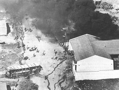 警察在直升機(jī)上投擲催淚瓦斯以驅(qū)散人群
