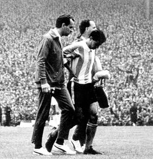 1966年7月23日,倫敦溫布利大球場。四分之一決賽中, 英格幸隊以1:0勝阿根廷隊。德國裁判克里特把阿根廷隊 隊長拉廷罰出場外。拉廷認為英隊中鋒赫斯特的進球越位, 并遷怒于裁判。本屆世界杯結(jié)束后,參賽的南美球隊將成 績欠佳的原因歸咎于歐洲人的地域情結(jié),并在4年后對此作出?