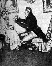 薩克雷像 | 薩克雷(1811-1864),英國(guó)作家。出身于資產(chǎn)階級(jí)家庭,受過(guò)良好的教 育。成年后繼承了父親的遺產(chǎn),但很快揮霍盡凈,只好自謀生路。他先學(xué)畫(huà)畫(huà),后從事寫(xiě)作,為報(bào)刊撰搞,發(fā)表散文、游記、札記、中短篇小說(shuō)等。他是多產(chǎn)作家, 作品集有35卷之多。代表作長(zhǎng)篇小說(shuō)《名利場(chǎng)》(1847)塑造英國(guó)19世紀(jì)貴 族資產(chǎn)階級(jí)的典型形象,揭露了他們的荒淫無(wú)恥、昏庸無(wú)能和道德敗壞;作者稱(chēng)他 們?yōu)?ldquo;為一群極端愚蠢自私的人,不顧一切地為非作歹而又熱烈地追求浮名浮利” 。薩克雷從私生活入手深刻地揭示了資本主義社會(huì)的現(xiàn)實(shí)關(guān)系。玩世不恭、冷嘲熱諷是他的小說(shuō)的重要特色,不過(guò)他有時(shí)也流露出傷感情緒。長(zhǎng)篇小說(shuō)《紐可姆一家 》(1853-1855)按規(guī)模是英國(guó)19世紀(jì)社會(huì)生活的宏偉畫(huà)卷,但感傷主義沖淡了現(xiàn)實(shí)主義的批判精神。他的傳世之作還有以英國(guó)17世紀(jì)末資產(chǎn)階級(jí)革命為背景的歷史小說(shuō)《亨利·艾斯蒙德》(1852)。 |  | | 《名利場(chǎng)》插圖 |