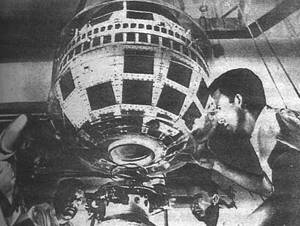 技師們把通訊衛(wèi)星裝配在 “三角”式火箭的第3級上